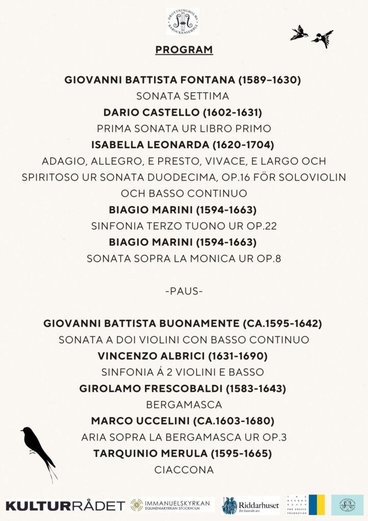 /24 sep (ons) 18.00 Lantmarskalkssalen i Riddarhuset Tidig italiensk violinmusik från 1600-talet,