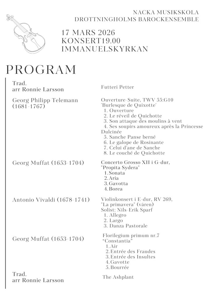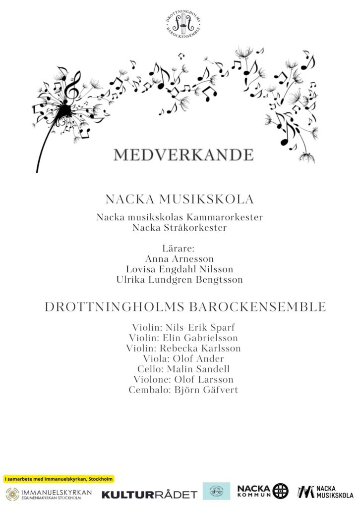 Upplev ett unikt konsertmöte där elever från Nacka musikskola spelar sida vid sida med musiker ur Drottningholms Barockensemble. Under två terminer har professionella barockmusiker och unga instrumentalister format ett gemensamt program med musik av barockens stora tonsättare, framfört med historisk klang och spelglädje. En inspirerande konsert som förenar generationer, väcker framtidens musikliv och låter barockmusiken leva vidare i nya händer.